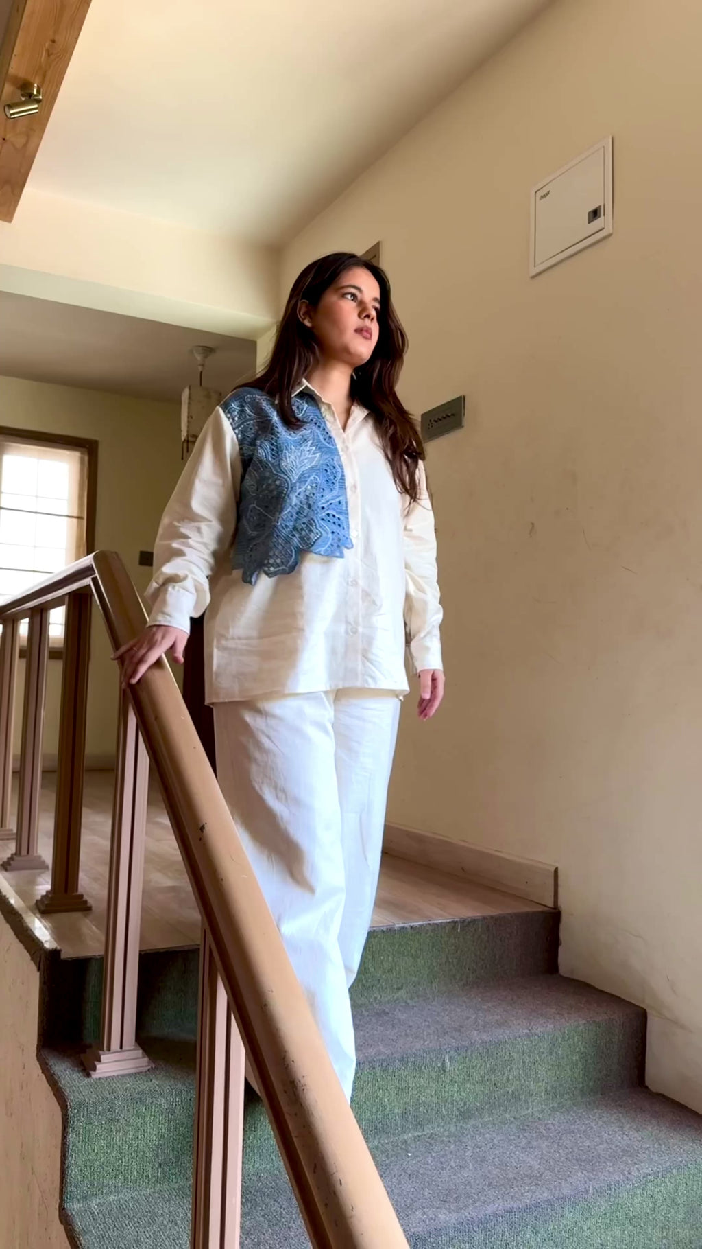 Relaxed linen shirt and pants set with a denim patch detail. Easy-going, everyday wear with a touch of edge.
