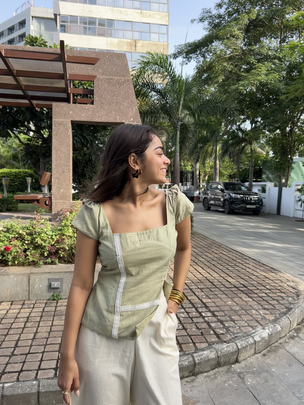 Square neck top paired with relaxed linen pants. Clean lines and easy elegance for everyday polish.