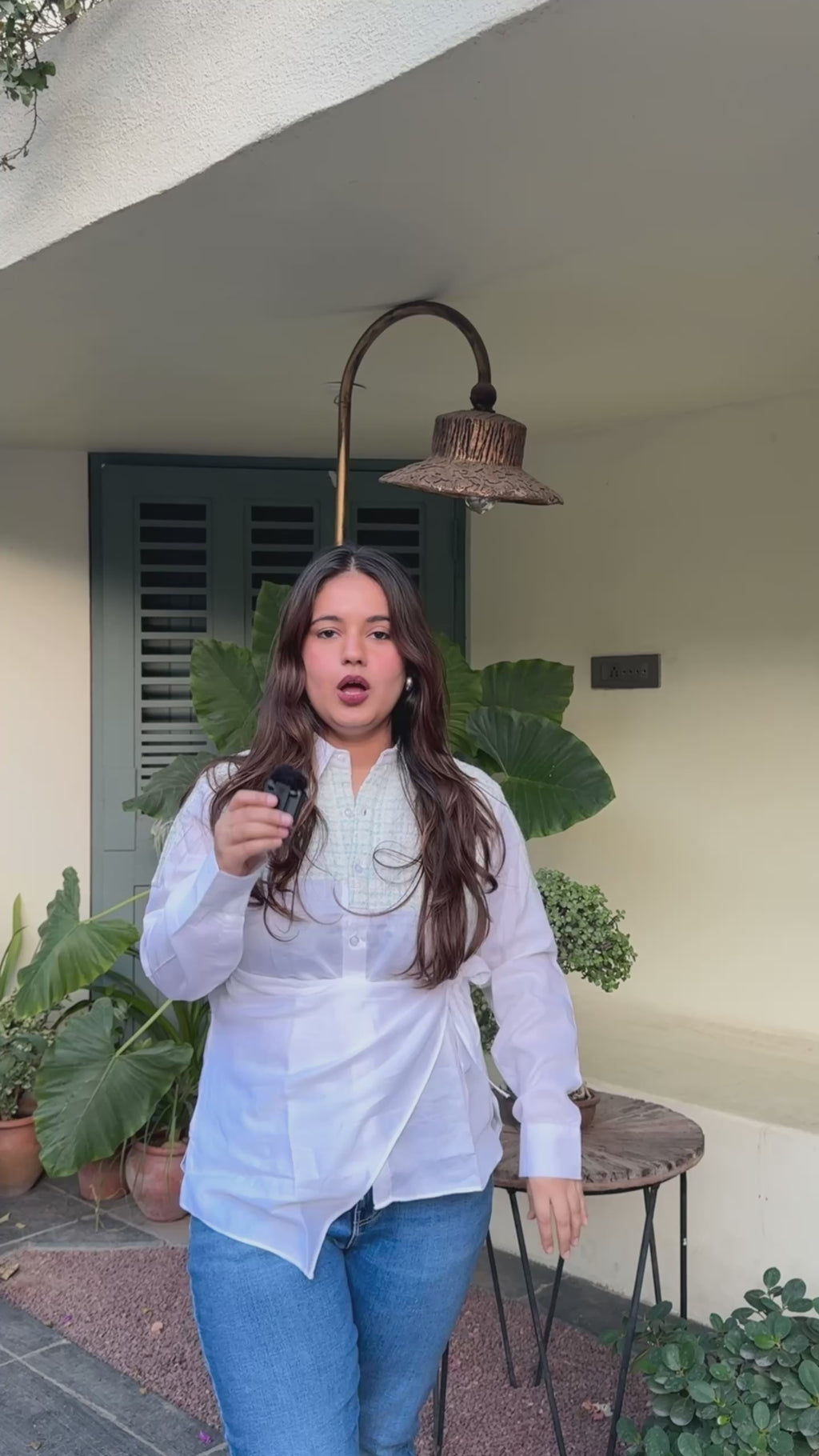 Classic white shirt with a tweed patch and waist tie-up detail. Structured, smart, and cinched just right